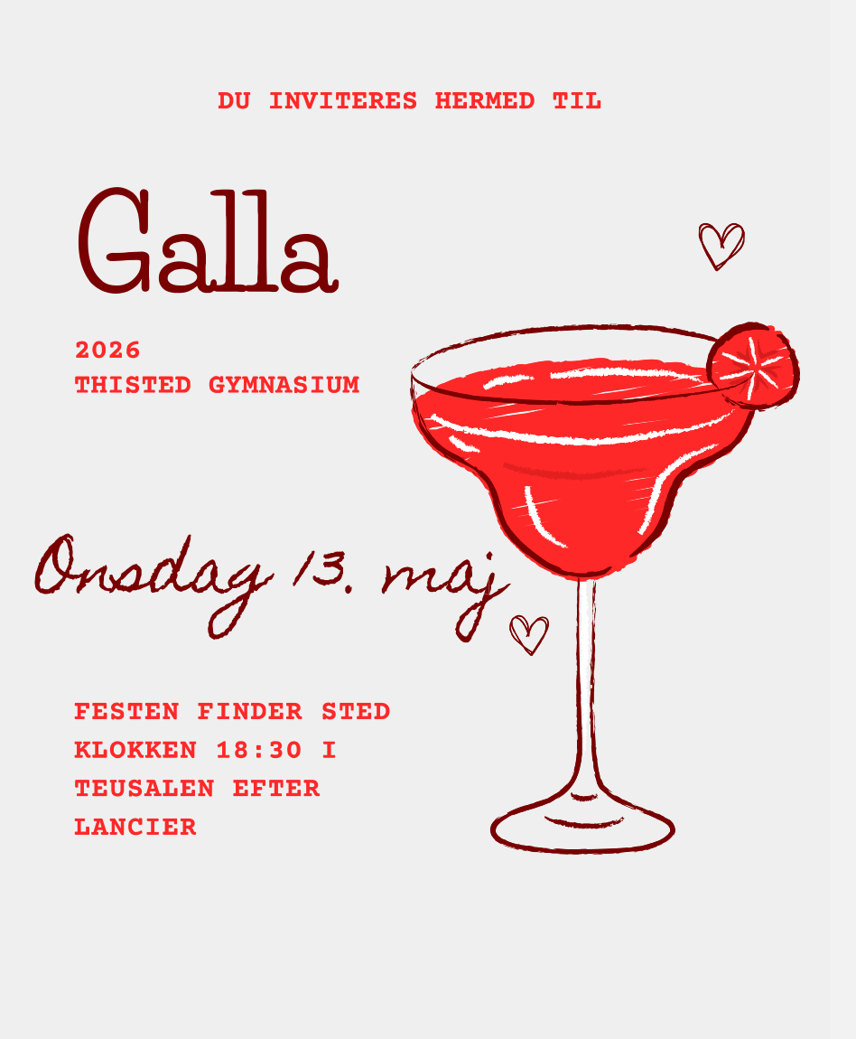 Fredag 26. juni kl. 10 afholder skolen dimission for alle afgangselever med familie i Thy Hal 1 (studenter skal møde senest kl. 9.45)